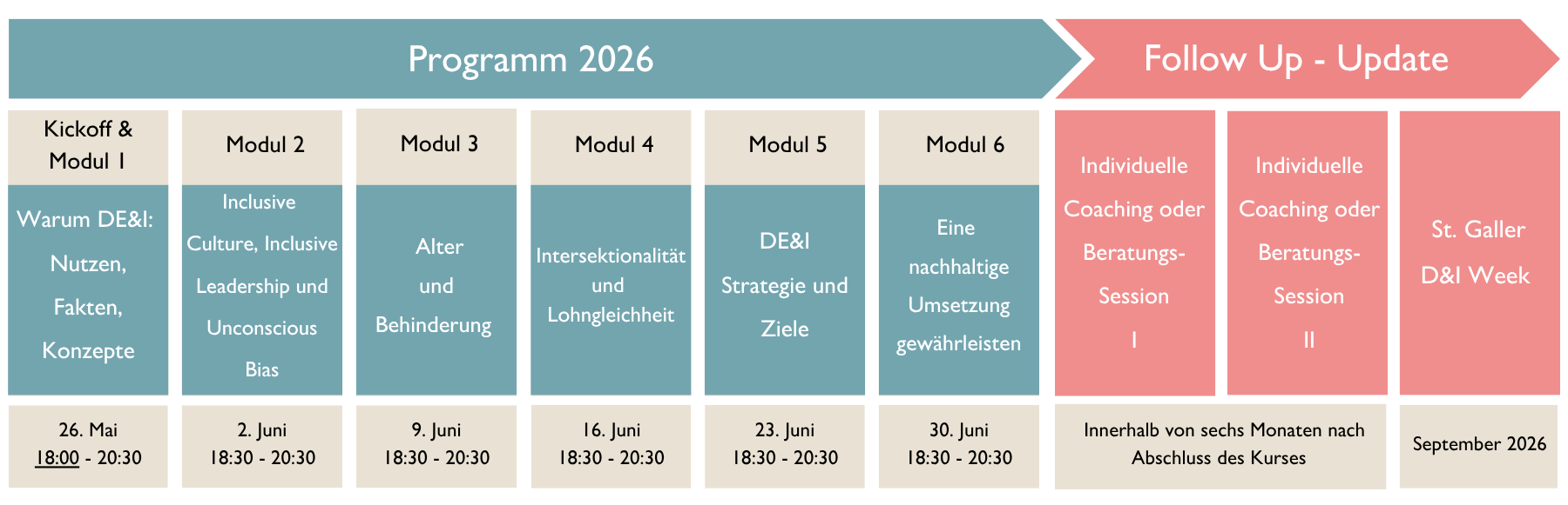 Wir legen grossen Wert auf die Nachhaltigkeit der Lerninhalte. Deshalb sind für jede Teilnehmerin und jeden Teilnehmer zwei individuelle Coaching- oder Beratungsgespräche vorgesehen. Diese dienen als Follow-up, um das Gelernte zu vertiefen, auf spezifische Herausforderungen in Ihrem Unternehmen einzugehen und die Umsetzung von DE&I-Initiativen erfolgreich zu begleiten.