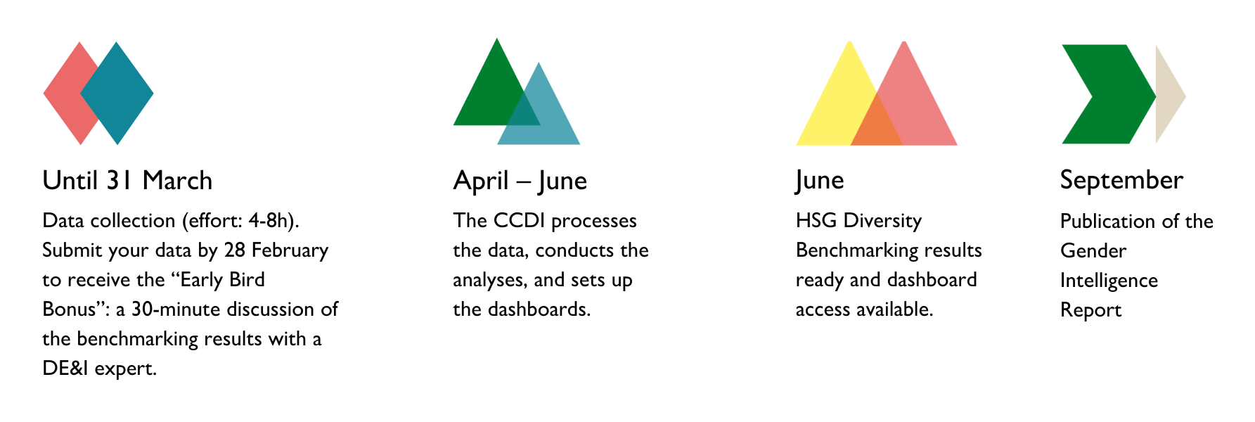 Get the benchmark: You receive an ESG relevant Diversity Benchmark,provided through the HSG Diversity Benchmarking and find out how your company is comparing to the industry peers or the full Switzerland sample.