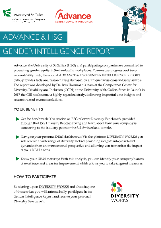 For companies interested in a detailed performance analysis on such KPIs, the HSG Diversity Benchmarking allows in-depth in-company analysis and cross-company comparison. By signing up for DIVERSITY WORKS and choosing one of the services, you will automatically participate in the Gender Intelligence Report (GIR) and receive your personal Diversity Benchmark.
