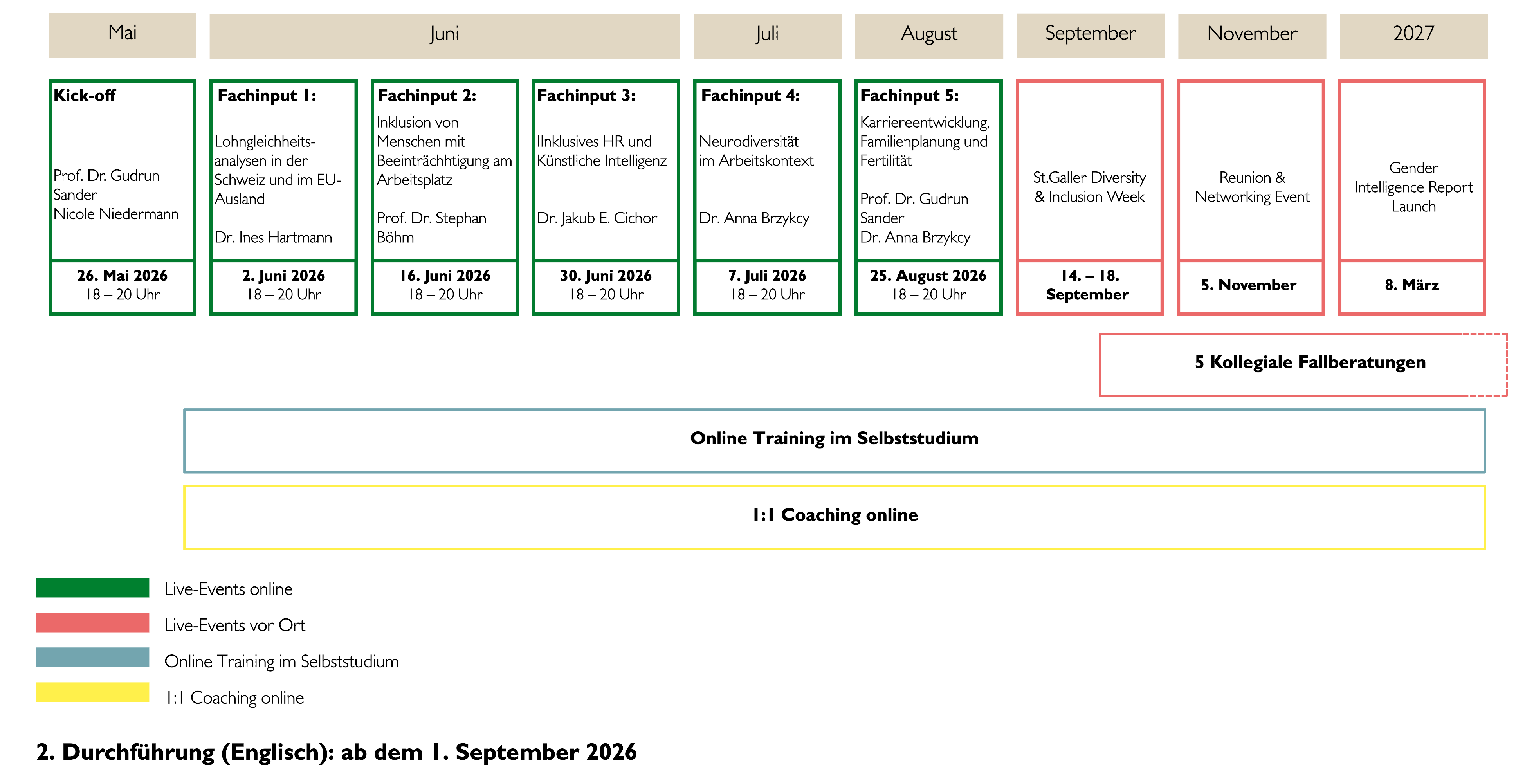 Abgerundet wird das Programm durch die kostenlose Teilnahme an der 10. Diversity & Inclusion Week, die optionale Teilnahme am Launch des Gender Intelligence Reports sowie eine jährliche Reunion mit Networking-Möglichkeiten. Der kontinuierliche Austausch in Ihrer Gruppe und die Möglichkeit, die Themen zu wählen, die aktuell für Sie zentral sind, unterstützen Sie dabei, Ihre professionelle Entwicklung in einem dynamischen Arbeitsumfeld gezielt und wirkungsvoll voranzutreiben.